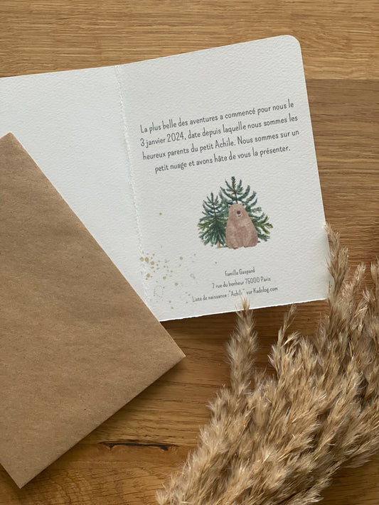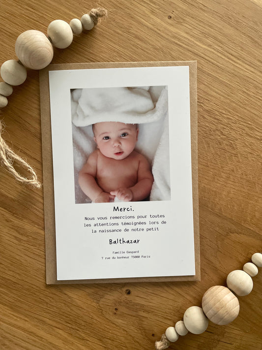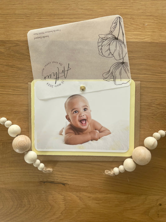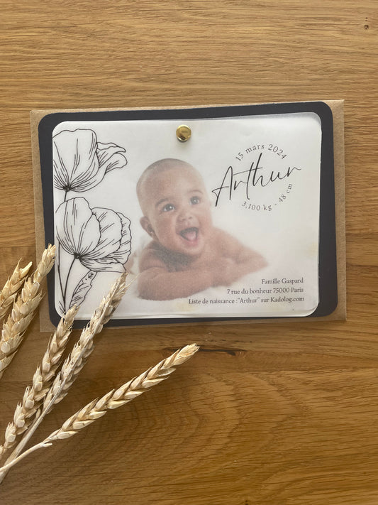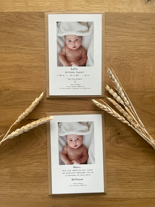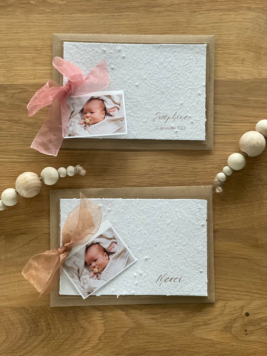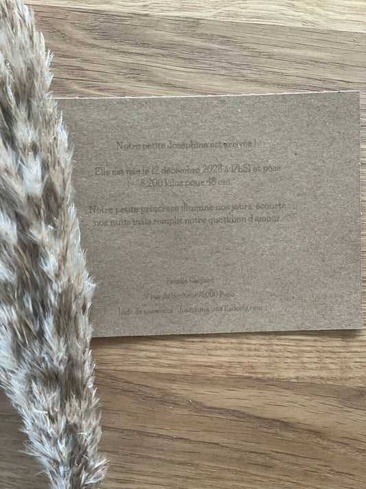Découvrez des visuels de faire-part, remerciements, étiquettes et nominettes déjà pré-créés et choisissez celui qui vous correspond. Cette option vous offre une base de design que vous pouvez personnaliser en ajustant les couleurs, les polices ainsi qu'en y ajoutant vos informations spécifiques (Noms, dates et détails de l'évènement).